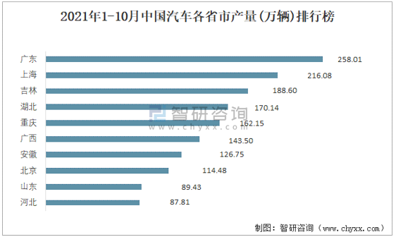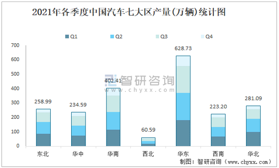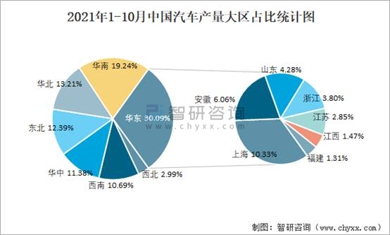 根據國家統計局數據顯示:2021年各季度(第四季度暫只統計10月數據)中國汽車主要集中在華東、華南、華北地區生產;2021年1-10月中國汽車產量大區分布不均衡,其中華東地區產量最高,特別是上海市貢獻了最多產量;2021年1-10月中國汽車各省市產量呈現梯隊式分布,廣東、上海、吉林等省市產量最多。