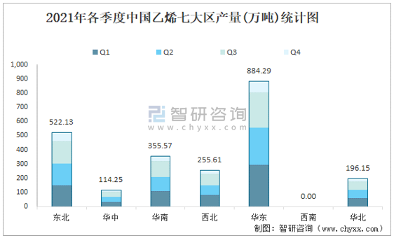 2021年各季度中國(guó)乙烯七大區(qū)產(chǎn)量統(tǒng)計(jì)圖