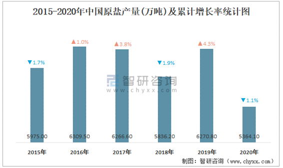 2015-2020年中國(guó)原鹽產(chǎn)量及累計(jì)增長(zhǎng)率統(tǒng)計(jì)圖