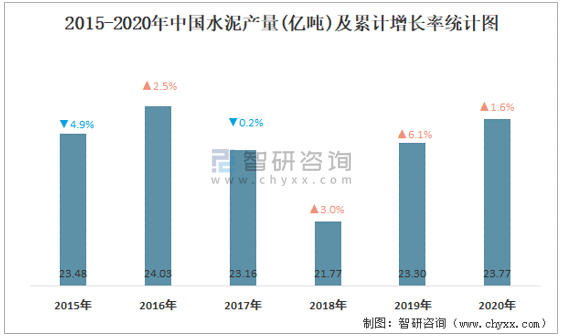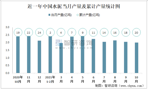 根據國家統計局數據顯示:2021年10月中國水泥產量為2億噸,同比下降17.1%;2021年1-10月中國水泥累計產量為19.7億噸,累計增長2.1%;2015-2020年中國水泥產量2018年跌至最低,此后逐年遞增。