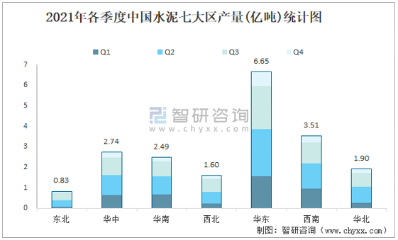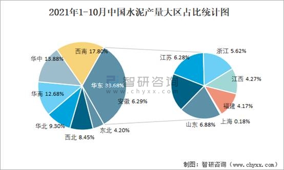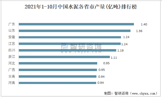 根據國家統計局數據顯示:2021年各季度(第四季度暫只統計10月數據)中國水泥主要集中在華東、西南、華中地區生產;2021年1-10月中國水泥產量大區分布不均衡,其中華東地區產量最高,特別是山東省貢獻了最多產量;2021年1-10月中國水泥各省市產量呈現梯隊式分布,廣東、山東、安徽等省產量最多。
