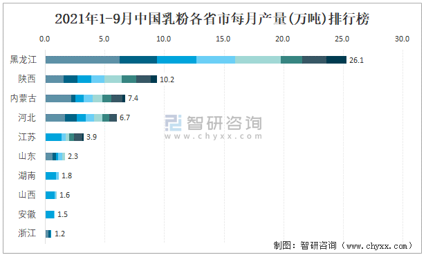 2021年1-9月中國(guó)乳粉各省市每月產(chǎn)量排行榜