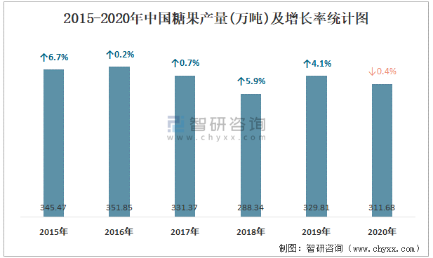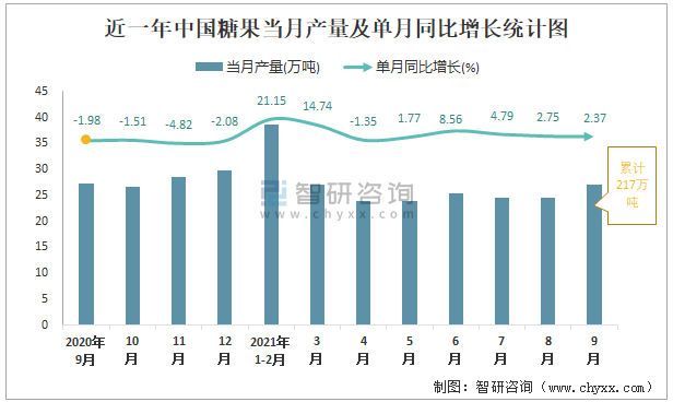 根據國家統計局數據顯示:2021年9月中國糖果產量為27.1萬噸,同比增長2.37%;2021年1-9月中國糖果累計產量為217萬噸,同比增長9.19%;2015-2020年中國糖果產量2018年跌至最低,次年有所回升。
