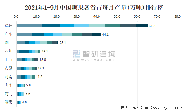 根據國家統計局數據顯示:2021年各季度中國糖果主要集中在華東、華南、華中地區生產;2021年1-9月中國糖果產量大區分布不均衡,其中華東地區產量最高,特別是福建省貢獻了最多產量;2021年1-9月中國糖果各省產量top1領先于其他前9名。