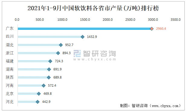 根據國家統計局數據顯示:2021年各季度中國軟飲料主要集中在華南、華東、西南地區生產;2021年1-9月中國軟飲料產量大區分布相對均衡,其中華南地區產量最高,特別是廣東省貢獻了最多產量;2021年1-9月中國軟飲料各省產量top1遙遙領先于其他前9名。