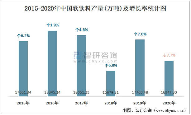 2015-2020年中國軟飲料產量及增長率統計圖