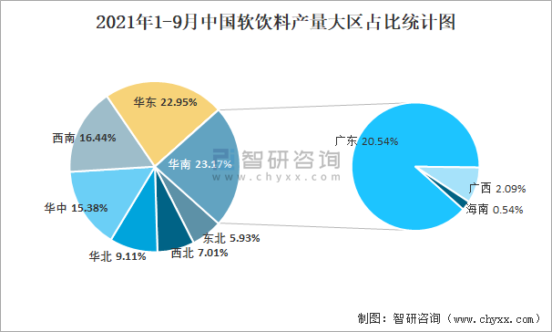 2021年1-9月中國軟飲料產量大區占比統計圖