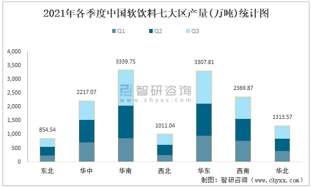 2021年各季度中國軟飲料七大區產量統計圖