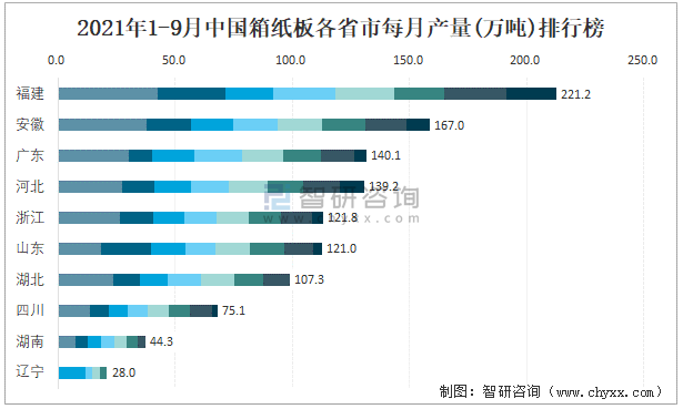 2021年1-9月中國箱紙板各省市每月產量排行榜