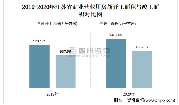2019-2020年江蘇省商業(yè)營業(yè)用房新開工面積與竣工面積對(duì)比圖