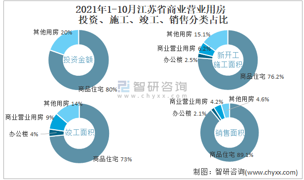 2021年1-10月江蘇省商業(yè)營業(yè)用房投資、施工、竣工、銷售分類占比