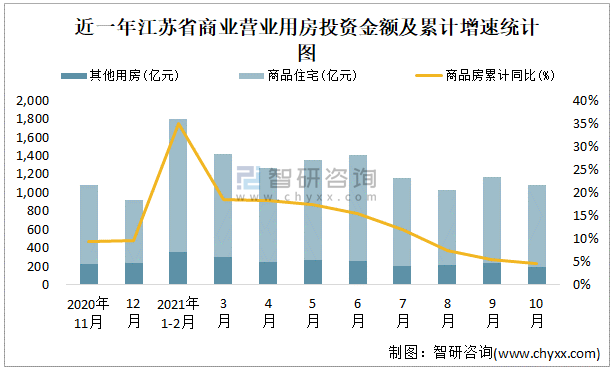 近一年江蘇省商業(yè)營業(yè)用房投資金額及累計(jì)增速統(tǒng)計(jì)圖