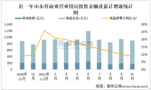 根據國家統計局數據統計可知:2021年9月山東省房地產開發投資商品房投資金額為904.86億元,其中包括辦公樓、商業營業用房等其他用房170.72億元(注:辦公樓、商業營業用房未分開統計);2021年1-10月山東省房地產開發投資包括商業營業用房在內的其他用房累計金額為1819.71億元。