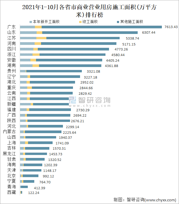 2021年1-10月各省市商業營業用房施工面積(萬平方米)排行榜