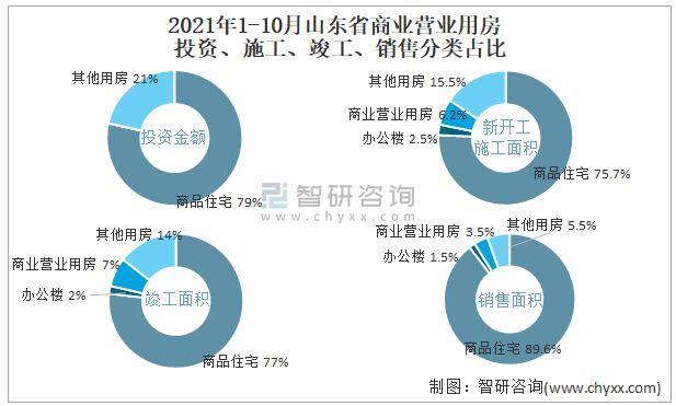 根據國家統計局數據統計可知:2021年1-10月山東省房地產開發企業在包括商業營業用房在內的其他用房投資金額占比為21.5%(注:只有投資金額中其他用房包含辦公樓、商業營業用房),商業營業用房的新開工面積與竣工面積所占比重差異不大,從銷售面積來看,商業營業用房銷售面積占比高于辦公樓銷售面積占比。