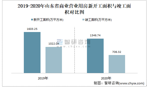 2019-2020年山東省商業營業用房新開工面積與竣工面積對比圖
