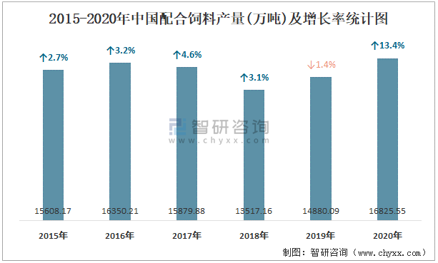 2015-2020年中國配合飼料產(chǎn)量及增長率統(tǒng)計(jì)圖