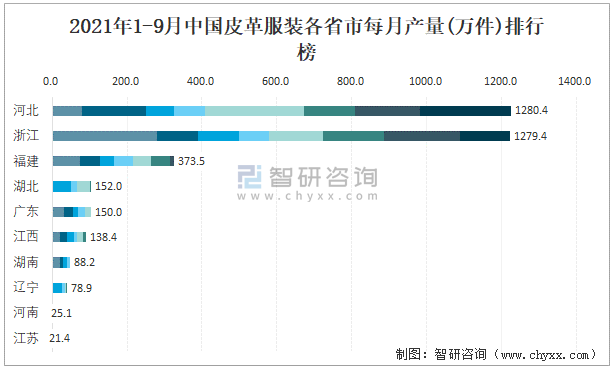 2021年1-9月中國皮革服裝各省市每月產量排行榜