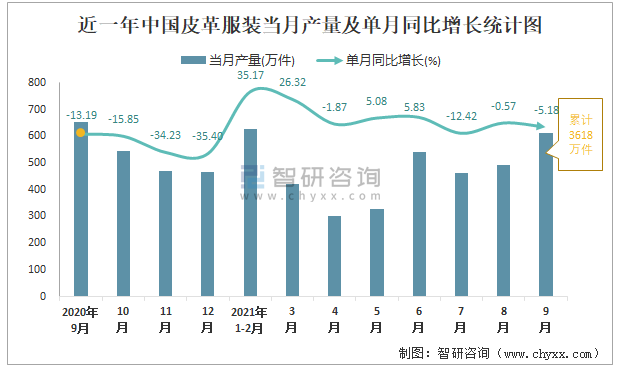 根據國家統計局數據顯示:2021年9月中國皮革服裝產量為611萬件,同比下降5.18%;2021年1-9月中國皮革服裝累計產量為3618萬件,同比增長0.97%;2015-2020年中國皮革服裝產量2016年達到最高,此后逐年遞減。