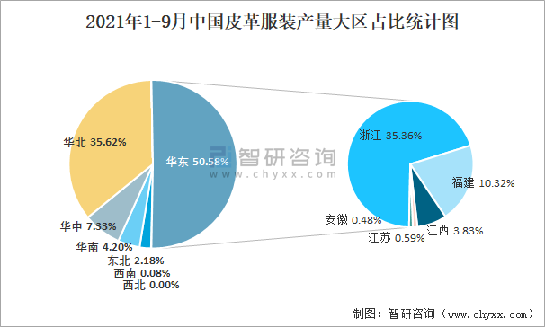 2021年1-9月中國皮革服裝產量為3618萬件 華東地區產量最高(占比50.58%)