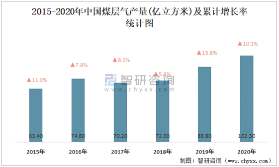 2015-2020年中國煤層氣產量及累計增長率統計圖
