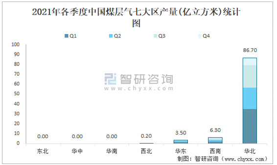 2021年各季度中國煤層氣七大區產量統計圖