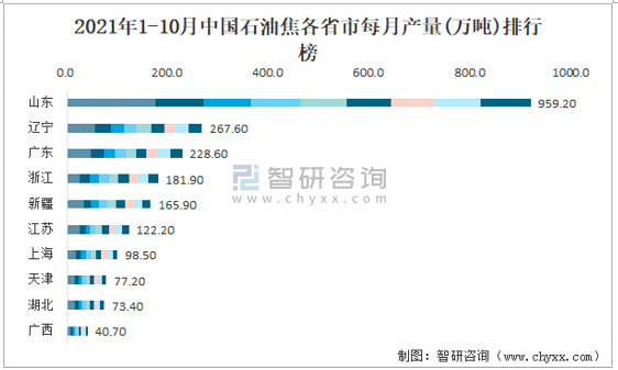 2021年1-10月中國石油焦各省市每月產量排行榜