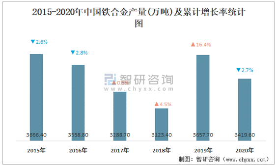 2015-2020年中國鐵合金產量及累計增長率統計圖