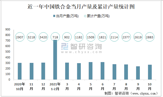 2021年1-10月中國鐵合金產量為2883.4萬噸 累計下降2.9%