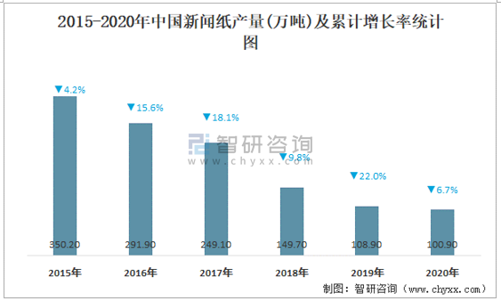 2015-2020年中國新聞紙產量及累計增長率統計圖