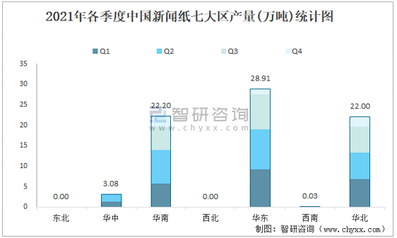 2021年各季度中國新聞紙七大區產量統計圖