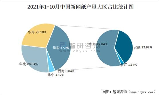 2021年1-10月中國新聞紙產量大區占比統計圖