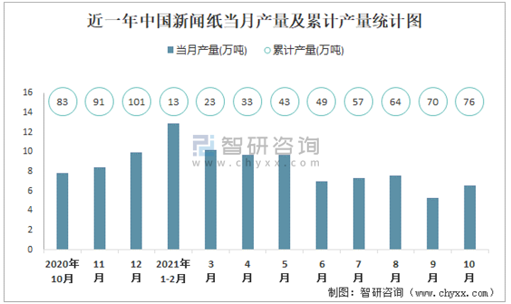近一年中國新聞紙當月產量及累計產量統計圖