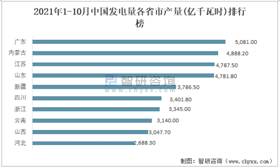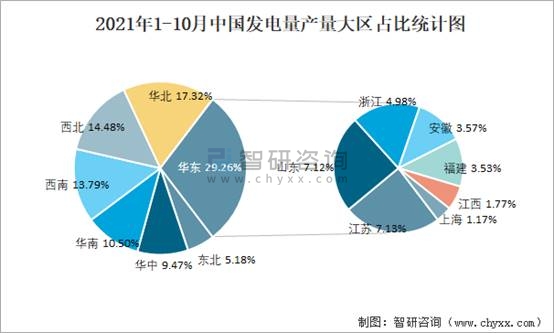 2021年1-10月中國發電量產量為67176億千瓦時 華東地區產量最高(占比29.3%)