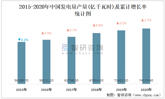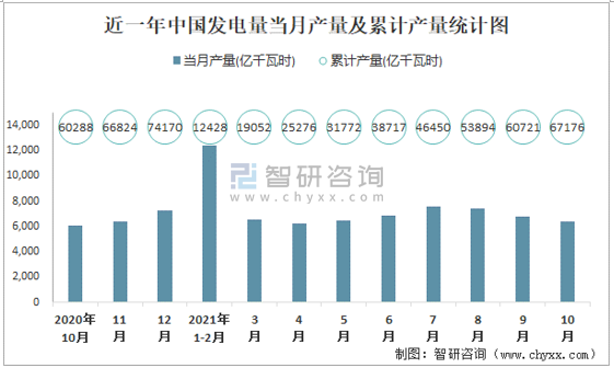 根據國家統計局數據顯示:2021年10月中國發電量產量為6394億千瓦時,同比增長3%;2021年1-10月中國發電量累計產量為67176億千瓦時,累計增長10%;2015-2020年中國發電量產量逐年遞增,2020年達到最高。