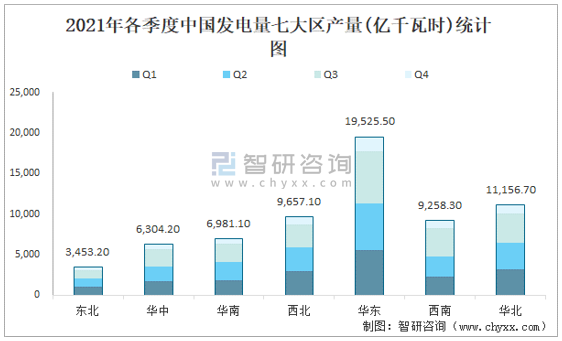 根據國家統計局數據顯示:2021年各季度(第四季度暫只統計10月數據)中國發電量主要集中在華東、華北、西北地區生產;2021年1-10月中國發電量產量大區分布不均衡,其中華東地區產量最高,特別是江蘇省貢獻了最多產量;2021年1-10月中國發電量各省市產量呈現梯隊式分布,廣東和內蒙古兩省產量最多。