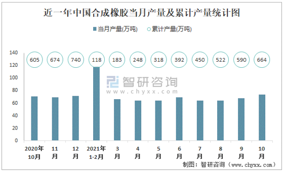 根據(jù)國家統(tǒng)計局?jǐn)?shù)據(jù)顯示:2021年10月中國合成橡膠產(chǎn)量為73.7萬噸,同比下降3.3%;2021年1-10月中國合成橡膠累計產(chǎn)量為664.4萬噸,累計增長0.6%;2015-2020年中國合成橡膠產(chǎn)量總體呈現(xiàn)上升趨勢,2020年達(dá)到最高。