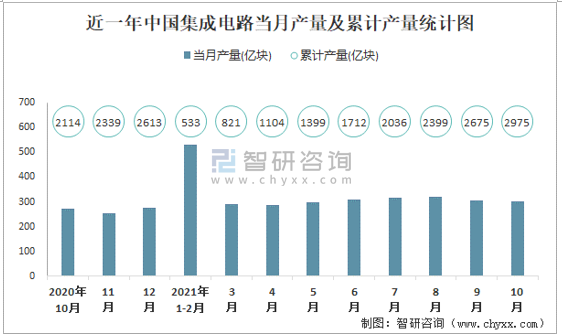 近一年中國集成電路當(dāng)月產(chǎn)量及累計產(chǎn)量統(tǒng)計圖