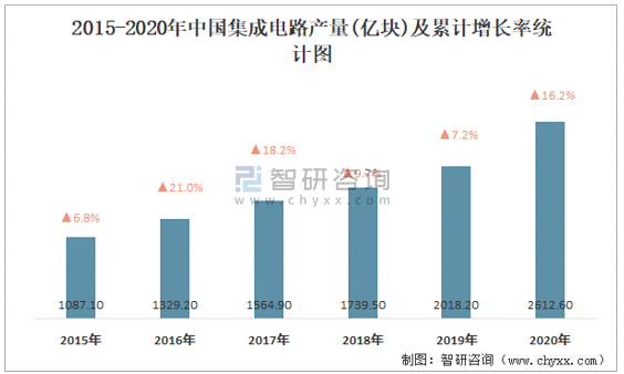 2015-2020年中國集成電路產(chǎn)量及累計增長率統(tǒng)計圖