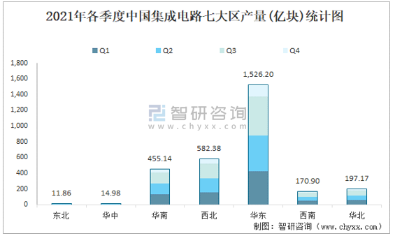 2021年各季度中國集成電路七大區(qū)產(chǎn)量統(tǒng)計圖