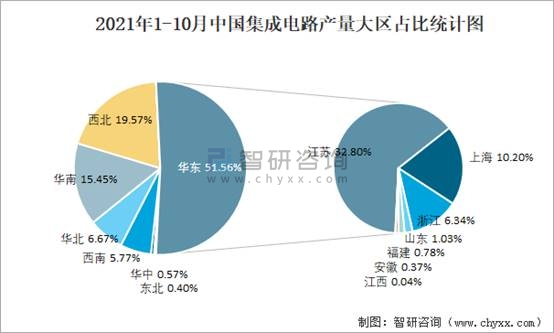 2021年1-10月中國集成電路產(chǎn)量大區(qū)占比統(tǒng)計圖