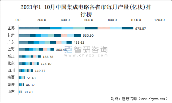 2021年1-10月中國集成電路各省市每月產(chǎn)量排行榜
