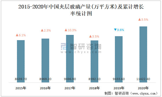 2015-2020年中國夾層玻璃產量及累計增長率統計圖