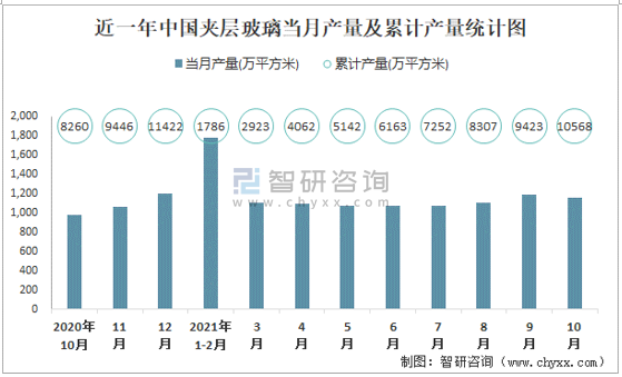2021年1-10月中國夾層玻璃產量為10568.1萬平方米 累計增長13.5%