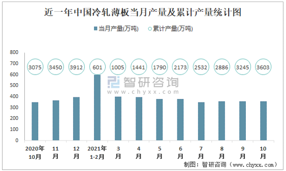 近一年中國(guó)冷軋薄板當(dāng)月產(chǎn)量及累計(jì)產(chǎn)量統(tǒng)計(jì)圖