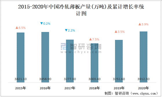2015-2020年中國(guó)冷軋薄板產(chǎn)量及累計(jì)增長(zhǎng)率統(tǒng)計(jì)圖