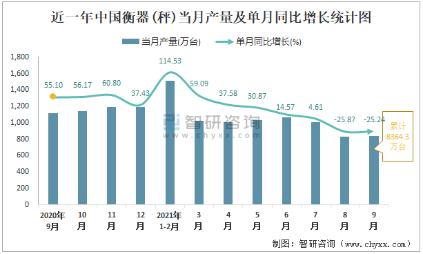 根據國家統計局數據顯示:2021年9月中國衡器(秤)產量為842萬臺,同比下降25.24%;2021年1-9月中國衡器(秤)累計產量為8364.3萬臺,同比增長19.3%;2015-2020年中國衡器(秤)產量總體呈上升趨勢,2020年達到最高。