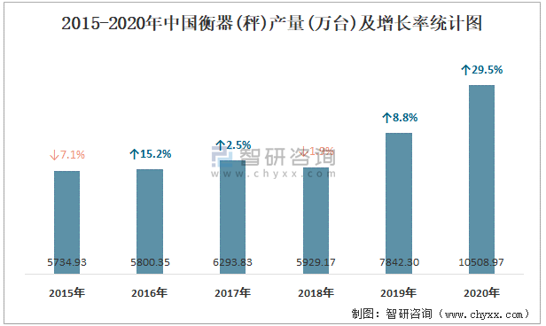2015-2020年中國衡器(秤)產量及增長率統計圖