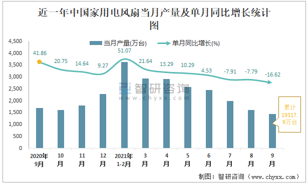 根據國家統計局數據顯示:2021年9月中國家用電風扇產量為1437萬臺,同比下降16.62%;2021年1-9月中國家用電風扇累計產量為19317.9萬臺,同比增長7.59%;2015-2020年中國家用電風扇產量逐年遞增,2020年達到最高。