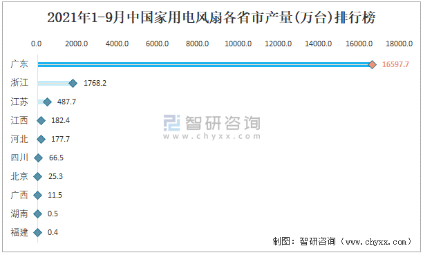 2021年1-9月中國家用電風扇各省市產量排行榜